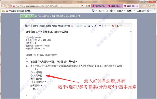 3.這時,考試酷會自動插入如下圖所示的單選題試題模板。如箭頭處www.sdyshb.cn所示,首先錄入試題的題干內(nèi)容、錄入試題的選項、并設(shè)置好試題的參考答案,然后填寫好該試題的“分?jǐn)?shù)”,這樣就錄入好了一道單選題