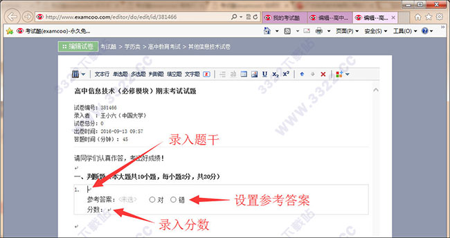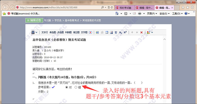 3.這時,考試酷會自動插入如下圖所示的判斷題試題模板。如箭頭處所示,首先錄入試題的題干內(nèi)容、并設(shè)置好試題的參考答案,然后填寫好該試題的“分?jǐn)?shù)”,這樣就錄入好了一道判斷題。
