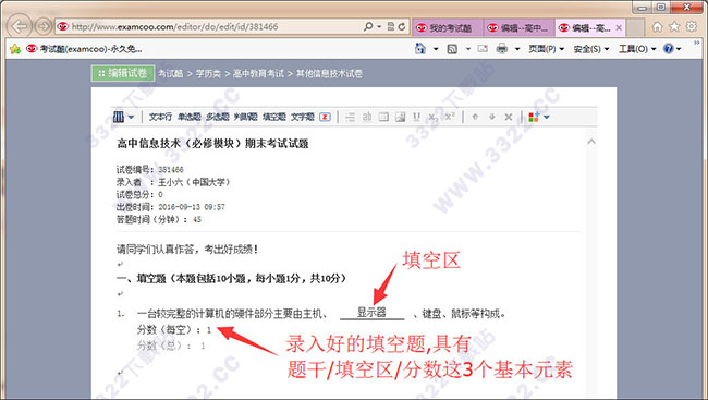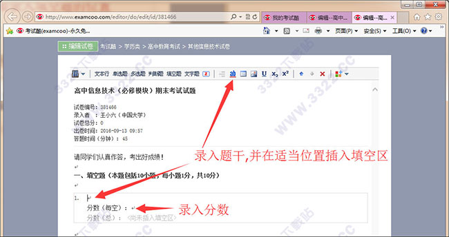 3.這時,考試酷會自動插入如下圖所示的填空題試題模板。如箭頭處所示,首先錄入試題的題干內(nèi)容、插入至少一個填空區(qū)并設(shè)置好參考答案,然后填寫好該試題的“分?jǐn)?shù)”,這樣就錄入好了一道填空題