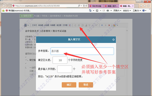 4.填空題必須插入1個或多個填空區(qū),并設(shè)置好參考答案,如下圖所示