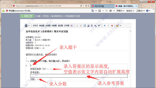 3.這時,考試酷會自動插入如下圖所示的文字題試題模板。如箭頭處所示,首先錄入試題的題干內(nèi)容、錄入或不錄入答案區(qū)高度、設(shè)置好參考答案,然后填寫好該試題的“分?jǐn)?shù)”,這樣就錄入好了一道文字題。這里的“答案區(qū)高度”,指的是用于考生作答的答題區(qū)的高度(以行數(shù)表示)。例如輸入“5”則表示答題區(qū)顯示為5行文字的高度;而如果不輸入任何值,則表示答題區(qū)高度會跟隨考生作答的文字內(nèi)容的多少而自動擴(kuò)展。
