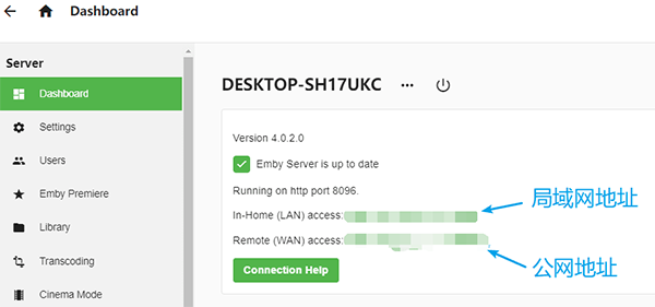 10、最后到達管理頁面,可以看到我們公網(wǎng)和內(nèi)網(wǎng)的ip信息。局域網(wǎng)客戶端直接輸入內(nèi)網(wǎng)地址:端口號即可訪問 Emby 流媒體。