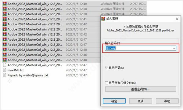 1、下載后對其進行解壓,同時需要輸入解壓密碼@vposy,由于軟件過大,因此解壓會比較耗時,如果在解壓時出現(xiàn)了問題可能是有的包沒下載完整或下載時出錯了,畢竟下載大文件非常容易出現(xiàn)壞檔,下載壓縮包后注意校驗;