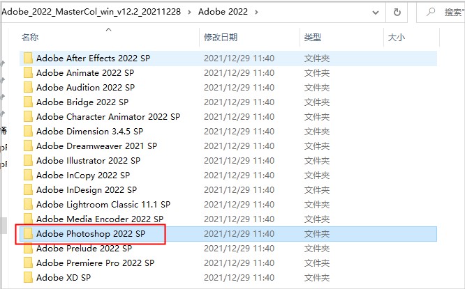 5、如果要安裝單獨一個版本就用包中的sp版,例如:ps2022版,首先“Adobe 2022”-“Adobe Photoshop 2022 SP”