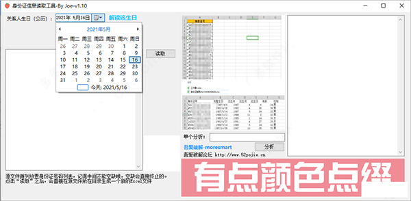 身份證信息讀取工具是一款用來幫助一些需要讀書省份證信息的設(shè)備搭配使用的信息讀取軟件,軟件她體積小巧,通過它可用戶主要需要導(dǎo)入身份證號(hào)碼列表即可輕輕松松的幫助用戶在源文件所在目錄中生成一個(gè)新的Excel文件,支持在Excel的表頭寫出關(guān)系人的信息,總的來說是一份非常好用的小工具!