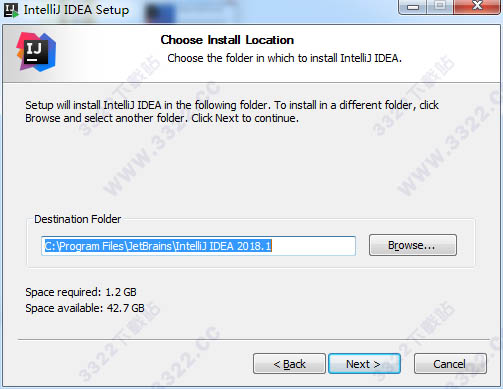 2.選擇安裝位置,默認(rèn)路徑為“C:\Program Files\JetBrains\IntelliJ IDEA 2018.1”點(diǎn)擊“browse”可更改目錄,但是建議不要去更改保持默認(rèn)即可,這樣才方便等下的破解操作,如下圖所示: