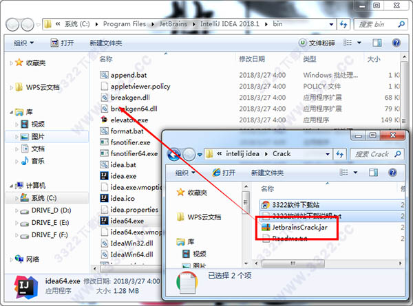 1.安裝好后,先不要打開軟件,回到數(shù)據(jù)包中將破解補(bǔ)丁“JetbrainsCrack.jar”復(fù)制到軟件的安裝,目錄中“C:\Program Files\JetBrains\IntelliJ IDEA 2018.1\bin”