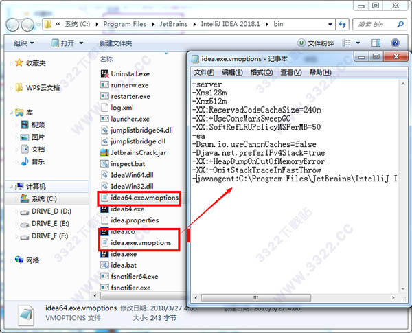 2.再用記事本打開“idea64.exe.vmoptions”和“idea.exe.vmoptions”這兩個文件,依次再后面添加破解文件的路徑,如小編的路徑為:-javaagent:C:\Program Files\JetBrains\IntelliJ IDEA 2018.1\bin\JetbrainsCrack.jar