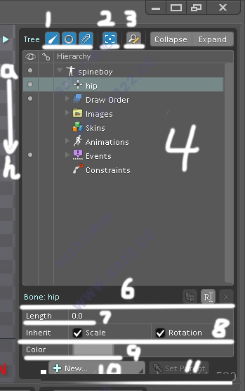 10.創(chuàng)建:可以在骨骼下創(chuàng)建骨骼、資源夾(Slot)、皮膚占位符(Skin Placeholder)、邊界框(Bounding Box)。不要問為什么不能創(chuàng)建圖片這么2的問題了吧。都說了圖片是從圖片(Images)拖到進(jìn)來的。