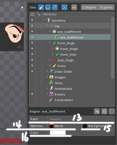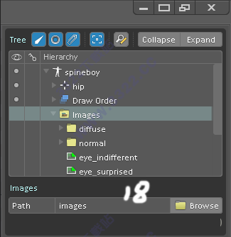 d)圖片路徑:這里顯示硬盤上的圖片資源。Spine只是從路徑引用圖片,并沒有把文件導(dǎo)進(jìn)項目。只是原封不動的顯示硬盤上文件夾的內(nèi)容。