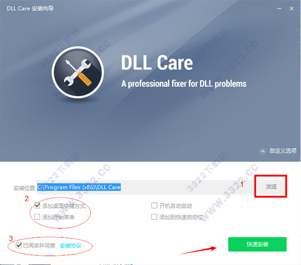1.下載好數(shù)據(jù)包后,直接解壓用鼠標(biāo)雙擊“DLLCare_Setup.exe”打開進入安裝向?qū)Вc擊“瀏覽”可隨意更改安裝目錄,默認(rèn)路徑為“C:\Program Files (x86)\DLL Care”。然后在在創(chuàng)建桌面快捷方式前面勾上,在勾選同意相關(guān)協(xié)議,最后點擊“快速安裝”