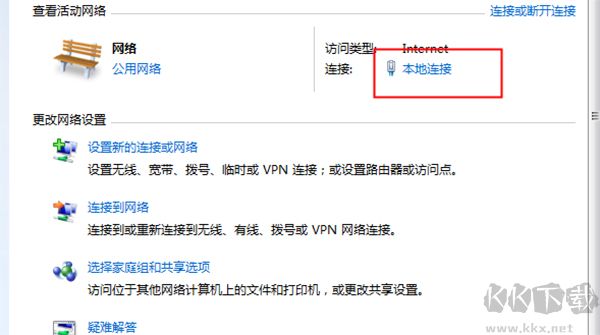 3、進(jìn)入網(wǎng)絡(luò)和共享中心,點(diǎn)擊“更改適配器設(shè)置”或者直接點(diǎn)擊“本地連接”;
