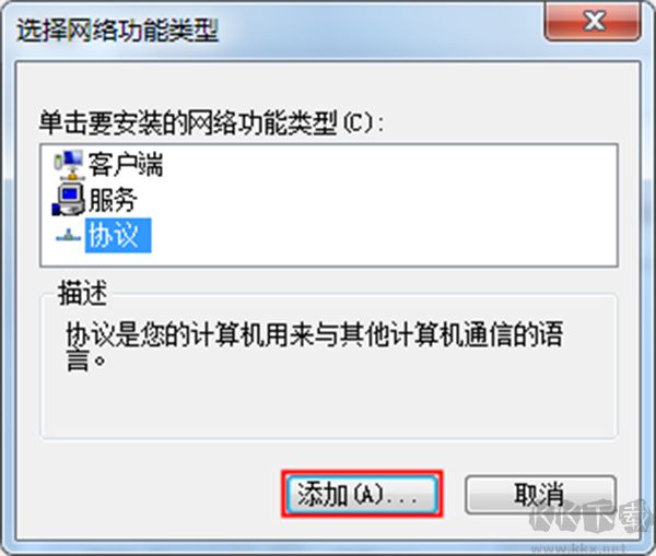 6、點(diǎn)擊選中“協(xié)議”,再點(diǎn)下面的“添加”按鈕;