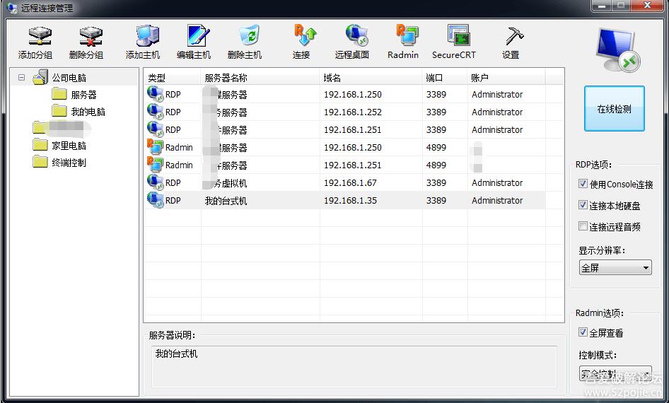 我的遠(yuǎn)程桌面是吾愛(ài)網(wǎng)友寫的一款RADMIN+SSH連接管理軟件,強(qiáng)大的遠(yuǎn)程桌面管理工具。它具有非常多的功能,支持遠(yuǎn)程桌面、RADMIN、SSH主機(jī)的管理,雙擊主機(jī)即可打開(kāi)連接。是網(wǎng)維人員,站長(zhǎng)必備的一款工具,本軟件開(kāi)源,所以大家不必?fù)?dān)心安全問(wèn)題。