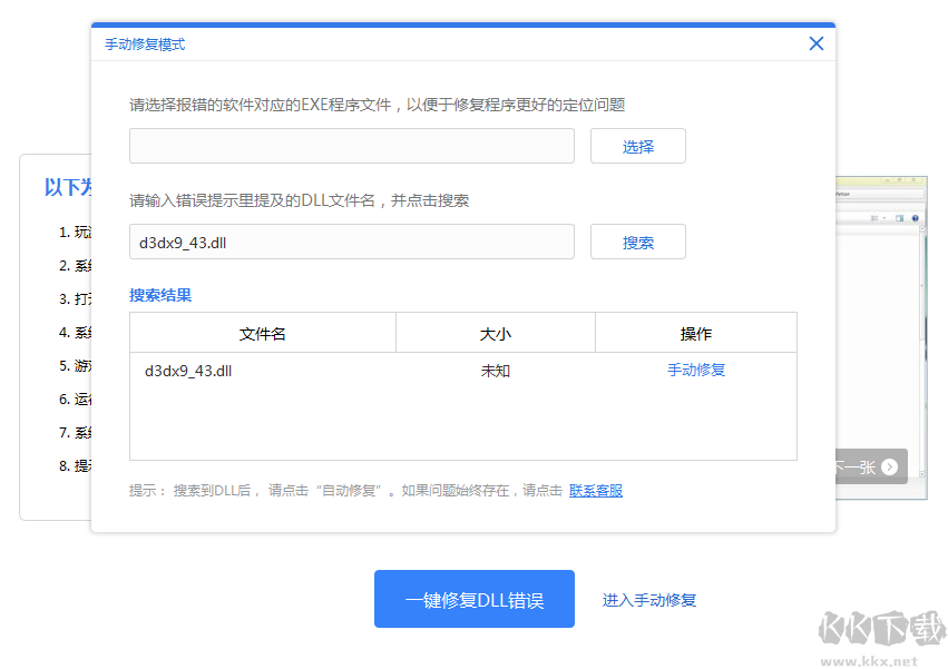 d3dx9_43.dll修復(fù)工具是一種功能強(qiáng)大的系統(tǒng)工具,它可以幫助用戶快速定位和修復(fù)系統(tǒng)中的DLL文件錯(cuò)誤,提高系統(tǒng)性能和穩(wěn)定性。該軟件具有簡(jiǎn)單易用的界面和強(qiáng)大的功能,適用于各種Windows操作系統(tǒng),包括Windows XP、Windows 7、Windows 8和Windows 10等!有需要的朋友不要錯(cuò)過(guò),KK下載站推薦大家下載體驗(yàn)!