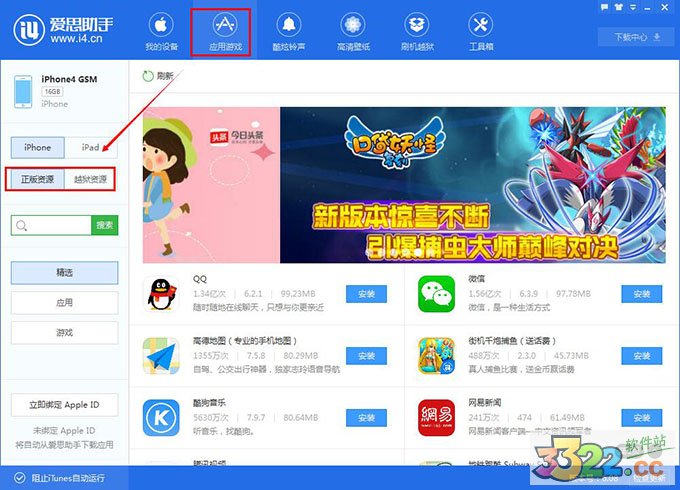 點擊上方“應(yīng)用游戲”即可看到“正版資源”“越獄資源”;如下圖所示: