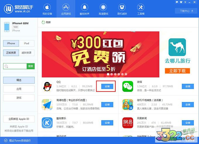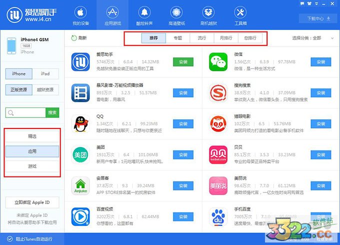 2.在愛思助手PC版 V6中,我們給大家分了三大類,您可以直接搜索下載您想要的 APP應(yīng)用,也可以進入我們的分類去選擇你喜歡的應(yīng)用;此外,“應(yīng)用“和”“游戲”里,我們另外又劃分出了推薦、專題、流行、月排行、總排行等,讓你一目了然小伙伴們都愛玩什么;