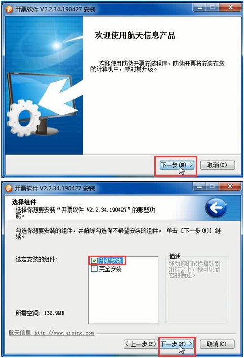 二、將下載的開票軟件V2.2.34.190427解壓,安裝時點擊“升級安裝”直到下一步完成即可。