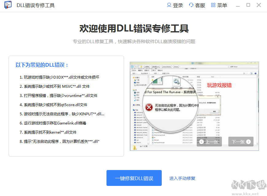 DLL文件修復(fù)工具是一種專門用于修復(fù)DLL文件的軟件工具。DLL文件(Dynamic Link Library)是一種動(dòng)態(tài)鏈接庫文件,它包含了一些程序代碼和數(shù)據(jù),可以被多個(gè)程序共享,從而減少了程序的內(nèi)存占用和代碼冗余。但是,由于DLL文件經(jīng)常被多個(gè)程序使用,一旦它出現(xiàn)問題,就會(huì)影響到多個(gè)程序的運(yùn)行,甚至導(dǎo)致系統(tǒng)崩潰。因此,DLL文件修復(fù)工具就應(yīng)運(yùn)而生!有需要的朋友不要錯(cuò)過,KK下載站推薦大家下載體驗(yàn)!