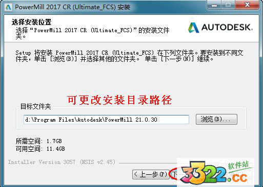 3、選擇PowerMill2017安裝路徑,可點(diǎn)擊“瀏覽”更改安裝目錄路徑或直接默認(rèn)路徑進(jìn)行安裝,但需注意該程序需要大約1.7G的磁盤空間