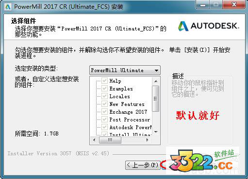 5、PowerMill2017組件的選擇安裝,可默認(rèn)或者自定義選定要想安裝的組件,非專業(yè)人士建議默認(rèn)即可,并點(diǎn)擊安裝