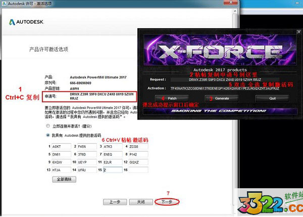 6、以管理員身份運(yùn)行注冊機(jī),然后將PowerMILL2017里面的申請?zhí)枏?fù)制到注冊機(jī)的Request中,然后點(diǎn)擊Generate,即可出現(xiàn)激活碼
