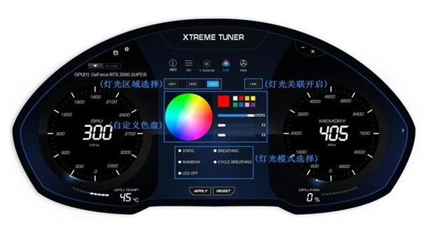 魔盤XtremeTuner支持影馳顯卡全程GeForceRTX20主打產(chǎn)品,包含含有流光燈的Gamer系列與普通RGB燈的將系列產(chǎn)品。軟件自動檢索獨(dú)立顯卡所支持的燈效方式并對外開放有關(guān)功能選擇項(xiàng)。針對配有多個燈效的型號規(guī)格,手機(jī)軟件更支持各燈效操縱??蛻暨\(yùn)用一個新的燈效后,該燈效便可儲存做為啟動默認(rèn)設(shè)置實(shí)際效果,不用每一次重新設(shè)置。