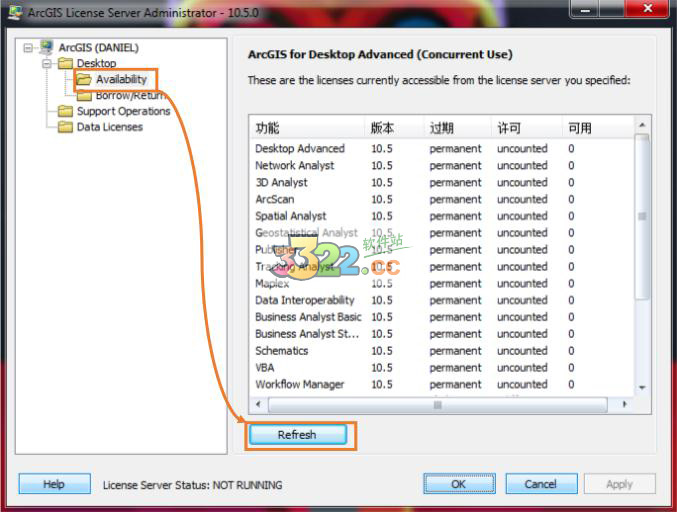 2、在剛才沒(méi)關(guān)閉的許可程序中進(jìn)行設(shè)置,點(diǎn)擊可用性 Availability→刷新 Refesh。