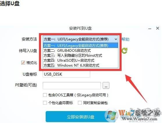 2、安裝方法,就是制作啟動盤方案,有7種方案,這邊選擇推薦的方案一,全能三分區(qū),支持大于4G的鏡像;
