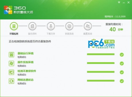 點擊 "重裝環(huán)境檢測"按鈕,程序?qū)㈤_始檢測您的系統(tǒng)是否符合重裝的條件,如果檢測通過,將出現(xiàn)重裝模式選擇頁面: