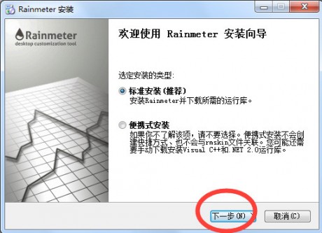 2.繼續(xù)安裝,將出現(xiàn)如下:我們需要設置Rainmeter(雨滴桌面)的安裝類型模式,在這里小編以【標準安裝】舉例說明。選擇Rainmeter(雨滴桌面)標準安裝并單擊【下一步】繼續(xù)設置。