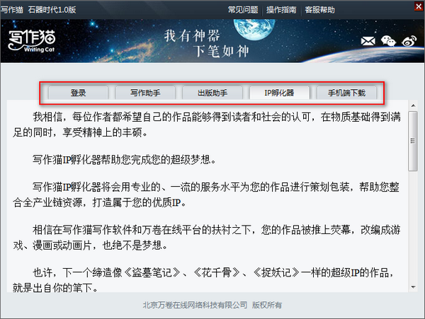 幫助:小說、劇本、雜文等模塊功能介紹以及本公司對作家提供增值服務(wù)介紹包括電子出版、按需出版、IP孵化器、手機(jī)端寫作貓下載二維碼;