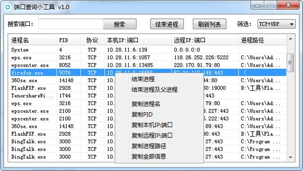 軟件功能很簡(jiǎn)單,就是列出所有本地監(jiān)聽(tīng)端口的進(jìn)程信息,自行選擇結(jié)束進(jìn)程,太多找不到端口的話(huà),可以搜索端口。