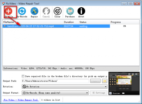 二,打開軟件,點(diǎn)擊ADD添加損壞視頻文件。