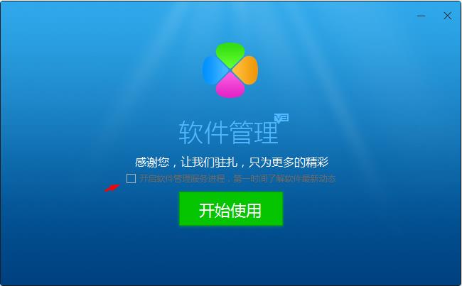 2、安裝完成,軟件管理服務(wù)可開啟也可以不必開啟,開啟的話會(huì)有進(jìn)程駐留的電腦中。開始開始使用就可以進(jìn)行軟件管理啦。