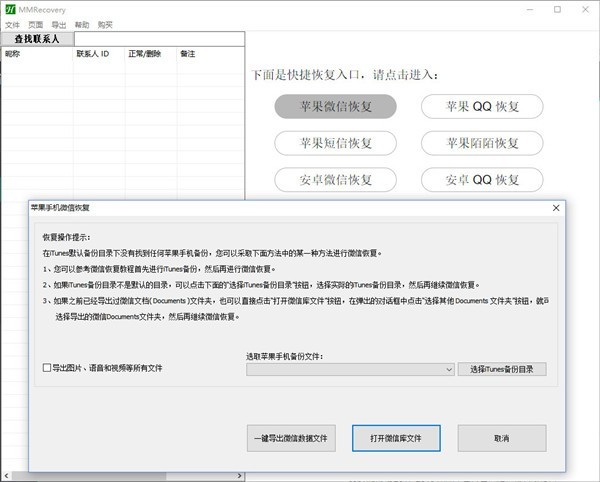 MMRecovery是一款支持QQ、微信數(shù)據(jù)恢復(fù)的軟件,它可以恢復(fù)蘋果、安卓手機(jī)中的QQ微信聊天信息、短信等等同時(shí)還支持陌陌,獨(dú)家再次還原與恢復(fù)技術(shù),支持查看、導(dǎo)出和恢復(fù)微信、QQ及短信聊天記錄。用戶只需插入手機(jī)即可實(shí)現(xiàn)微信等聊天記錄的快速恢復(fù),幫助你找回丟失的信息。