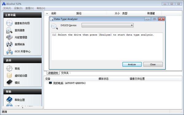 Alcohol 52%是一款在Alcohol 120%刻錄軟件中也包含Alcohol 52%功能的一款虛擬光驅(qū)軟件,說Alcohol 52%不包含光碟刻錄功能,主要是讓我們虛擬模擬出CD/DVD光驅(qū),如此你便可用它所模擬出的CD/DVD虛擬光驅(qū)來做任何CD/DVD光驅(qū)所能做的事。支持MDS,CCD,BIN,CUE,ISO,CDI,BWT,BWI,BWS,BWA等文件格式,需要在電腦上模擬光驅(qū)的用戶不要錯(cuò)過了哦!