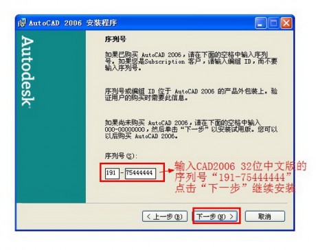 CAD2006 32位中文版的序列號“191-75444444” 輸入正確后點擊“下一步”繼續(xù)操作,如上圖: