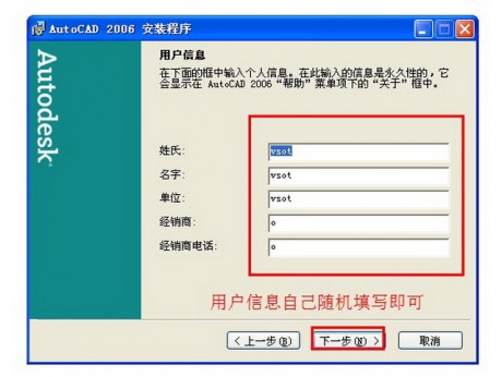 CAD的用戶信息自己隨意填寫即可 填寫完畢后點擊“下一步”按鈕,如上圖所示: