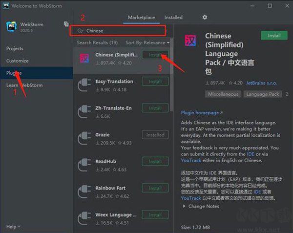 15、選擇“marketplace”接著在輸入框中輸入“Chinese”后即可找到漢化插件,點擊“install”進(jìn)行下載;