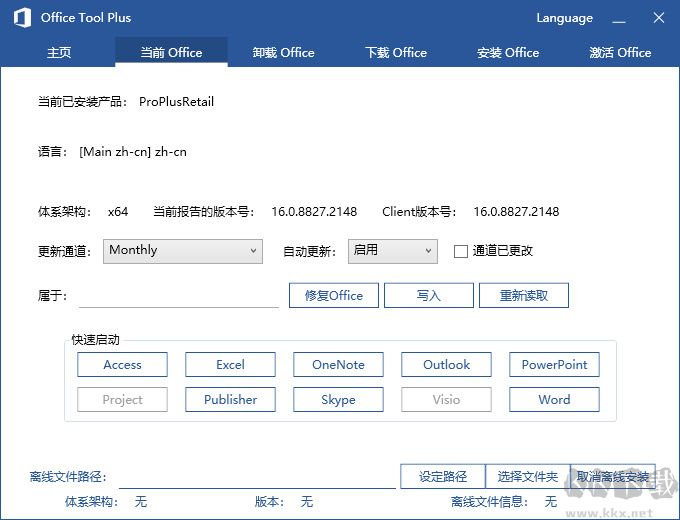 適用于Windows系統(tǒng);Office Tool 目前支持安裝 Office 2016, 2019 以及 Office 365,同時(shí)還可以指定 Office 的詳細(xì)授權(quán)版本,例如 Office 2016 零售版 或者 Office 2016 家庭版等。對于 Office 2013 以及更舊版本的 Office,Office Tool 不支持管理也不支持部署,僅有內(nèi)置的腳本、工具支持舊版本的 Office 的移除。