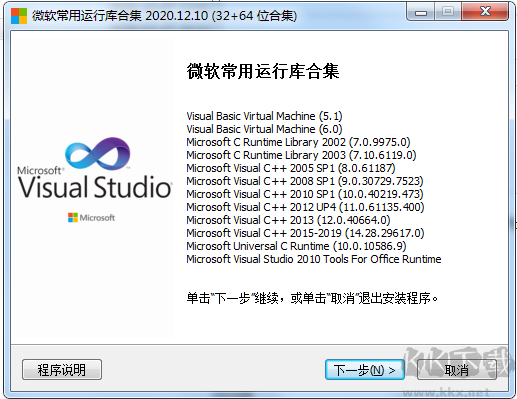 微軟運(yùn)行庫即微軟VC運(yùn)行庫,包含了VC++2005、VC++2008、VC++2010、VC++2012、VC++2013、VC++2015、VC++2017、VC++2019等軟件運(yùn)行必備的運(yùn)行庫組件,如果電腦遇到缺少DLL的問題或是游戲軟件無法運(yùn)行,那么安裝微軟VC運(yùn)行庫合集就可以解決了!本站提供的是微軟認(rèn)證,安全無毒的VC運(yùn)行庫合集,長期更新,歡迎下載安裝。