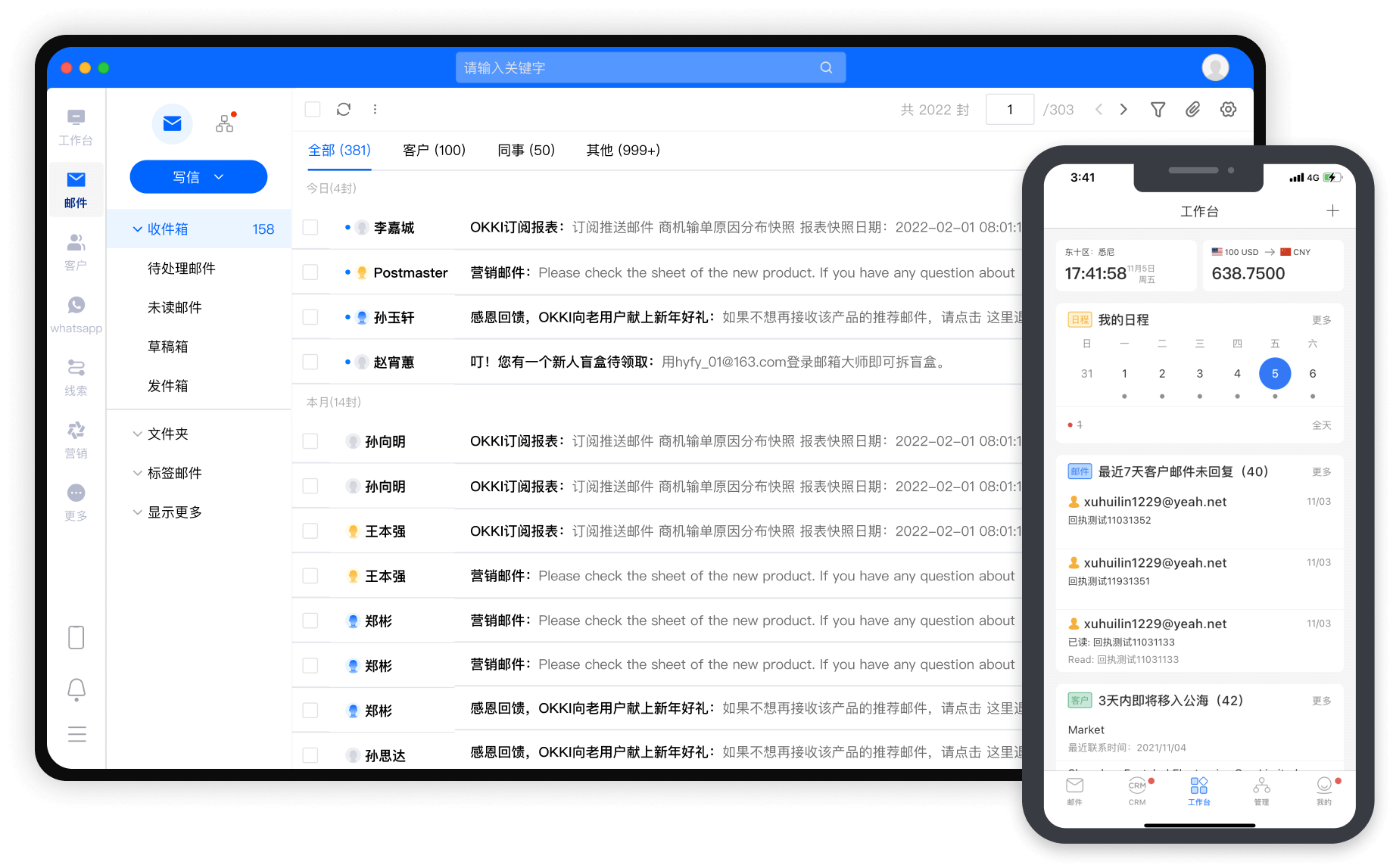 郵件數(shù)據(jù)多端實(shí)時(shí)同步更新,新郵件提醒,及時(shí)回復(fù)客戶郵件,鎖定每一個(gè)商機(jī);聯(lián)系人卡片,幫助快速識別客戶類型,聚合往來郵件,轉(zhuǎn)化郵件線索。