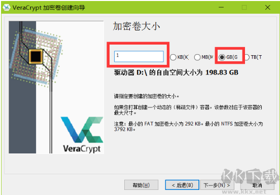 6.后面的而下一步下一步,就選擇空間大小,一般情況下看我們有多少東西是需要加密的,按照實(shí)際情況選擇,這里小編選擇1G。