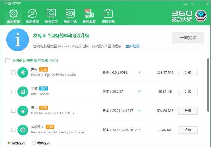驅(qū)動檢測功能可一鍵檢測驅(qū)動并完成安裝(內(nèi)置360驅(qū)動大師)