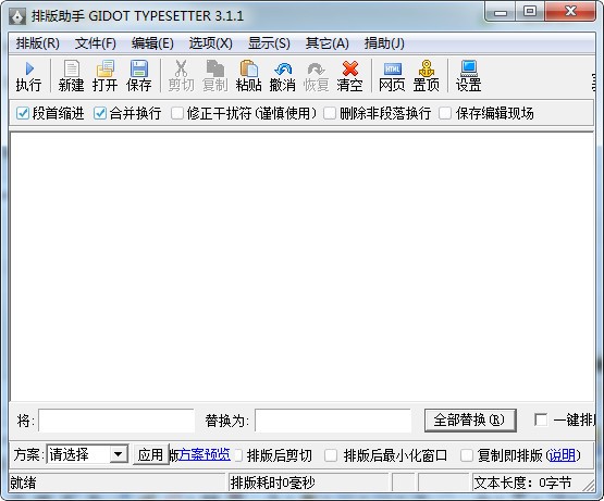 排版助手(gidot typesetter)是一款非常好用的文章排版工具,軟件中內(nèi)置“段首縮進”、“合并換行”、“刪除非段落換行”、“半角全角轉(zhuǎn)換”、“簡繁轉(zhuǎn)換”等一系列排版功能,可以幫助用戶快速完成文章排版。KK下載站為您提供排版助手(gidot typesetter) v4.0.1 綠色免安裝版下載,軟件無需安裝,且無任何捆綁軟件及廣告程序,經(jīng)常需要對文章進行排版的朋友可以下載使用哦!