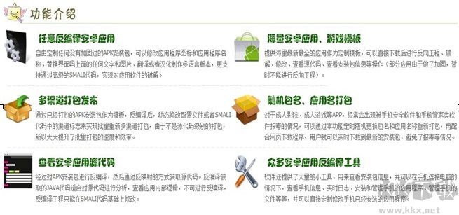 軟件名稱: 安卓修改大師 軟件介紹: 安卓修改大師可以讓您輕松將任何APK安裝包進行反編譯,替換應(yīng)用程序界面上的任何文字和圖片,并且通過代碼級別的修改,實現(xiàn)漢化、破解、功能增強,甚至可以在任何的界面添加自定義的代碼和功能。本軟件還提供多渠道打包工具,無需源代碼,直接通過APK安裝包進行多渠道打包。本軟件提供的反編譯功能,僅供安卓開發(fā)愛好者對安裝包進行反編譯研究之用,嚴禁將反編譯之后的安裝包作為商業(yè)用途。如有違反,與本軟件無關(guān)。