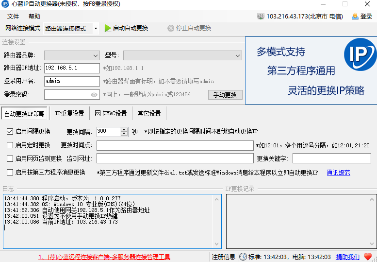 心藍(lán)IP自動(dòng)更換器是一款專為各品牌路由器設(shè)計(jì)的IP自動(dòng)更換工具。該軟件使用戶在特定網(wǎng)絡(luò)應(yīng)用中能夠方便地實(shí)現(xiàn)自動(dòng)更換IP的功能。該軟件還支持多種模式,并且兼容第三方程序,擁有靈活的自動(dòng)更換IP策略。如果你對(duì)此感興趣,請(qǐng)前往KK下載,親自體驗(yàn)一下吧!