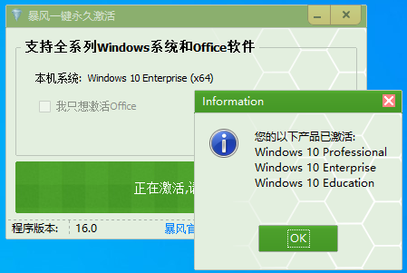 1.暴風激活工具隨著Windows10系統(tǒng)的普及,最近新添加針對Windows10系統(tǒng)的激活和最新版Office軟件的激活功能。