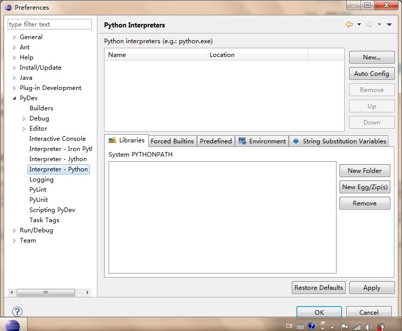 PyDev安裝好之后,需要配置解釋器。在 Eclipse 菜單欄中,選擇Window > Preferences > Pydev > Interpreter – Python,在此配置 Python。首先需要添加已安裝的解釋器。如果沒有下載安裝Python,請到官網(wǎng)下載2.x或者3.x版本:http://www.python.org/。